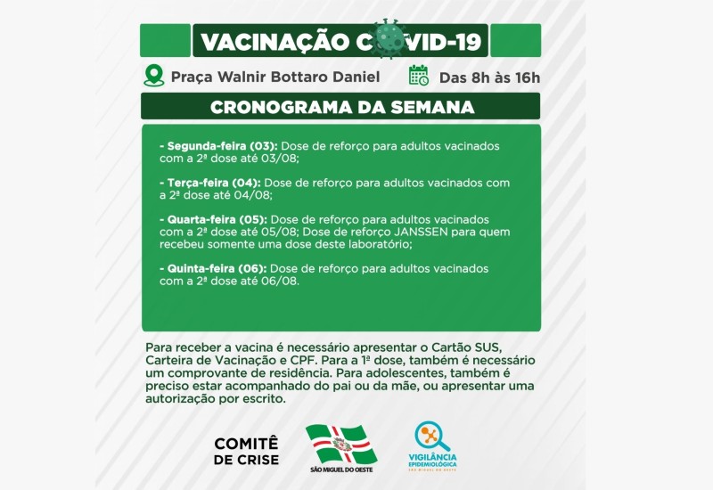 - Terça-feira (04): Dose de reforço para adultos vacinados com a 2ª dose até 04/08;
