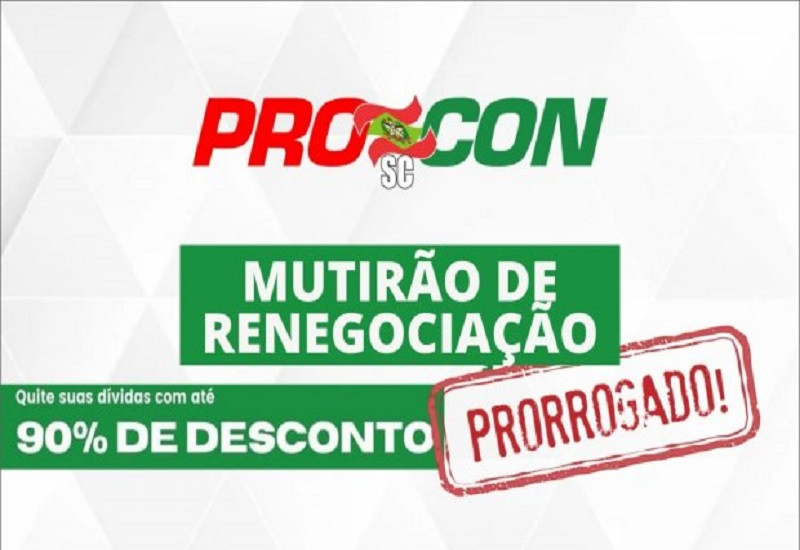 O PROCON/SC, órgão integrante da Secretaria de Estado do Desenvolvimento Econômico Sustentável, prorrogou até a próxima sexta-feira, 27, o mutirão para renegociação de dívidas dos consumidores, que devem procurar as agências das instituições bancárias do estado parceiras do evento, . Participam da ação o Banco do Brasil, Santander, Bradesco, Itaú, Koerich e a Caixa Econômica Federal, que está dando até 90% de desconto para quem tiver interesse em quitar seus débitos.