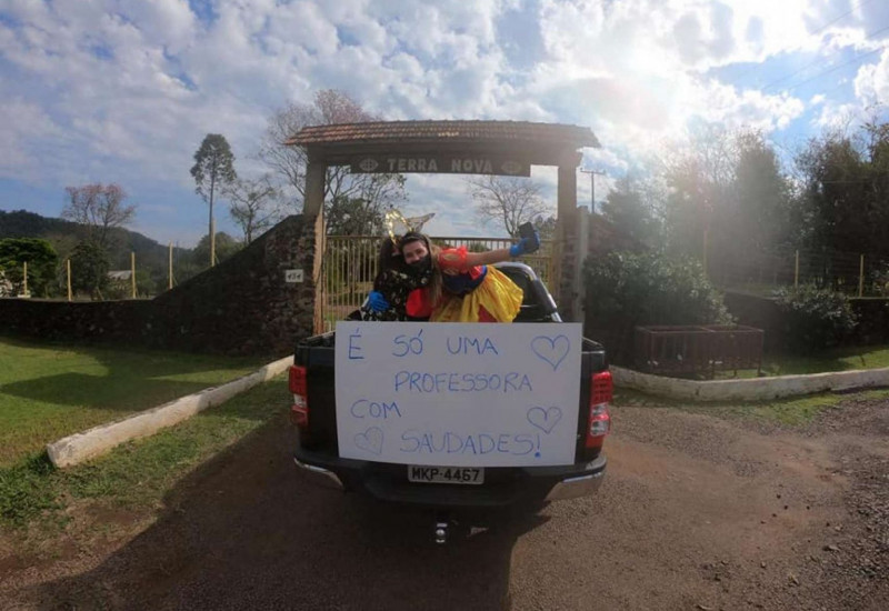 os bairros de Mondaí entregando doces aos alunos, fantasiada e com música para