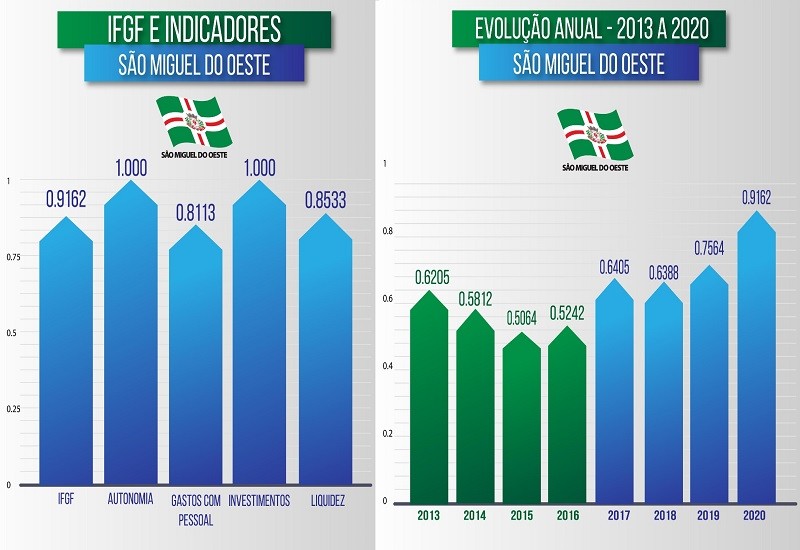 São Miguel do Oeste tem nota máxima, que é de 1 ponto, em Autonomia e em Investimentos. A Gestão Fiscal é avaliada em 0,9162, a Liquidez é de 0,8533 e os Gastos com Pessoal, 0,8113. Todas as notas são de excelência. Os dados têm como base o ano de 2020, um dos mais graves da história do país por conta da pandemia da Covid.