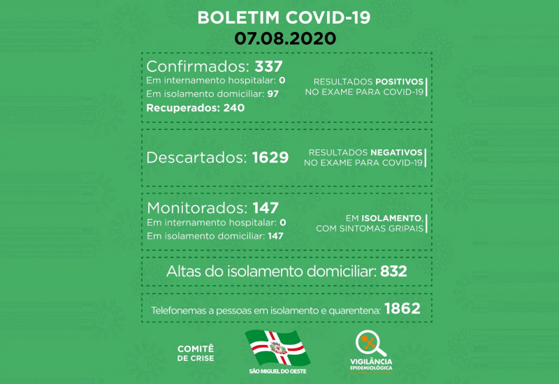 Ao todo, 337 pessoas foram confirmadas com a doença até o momento no município, das quais 240 estão recuperadas e 97 continuam com o vírus ativo.