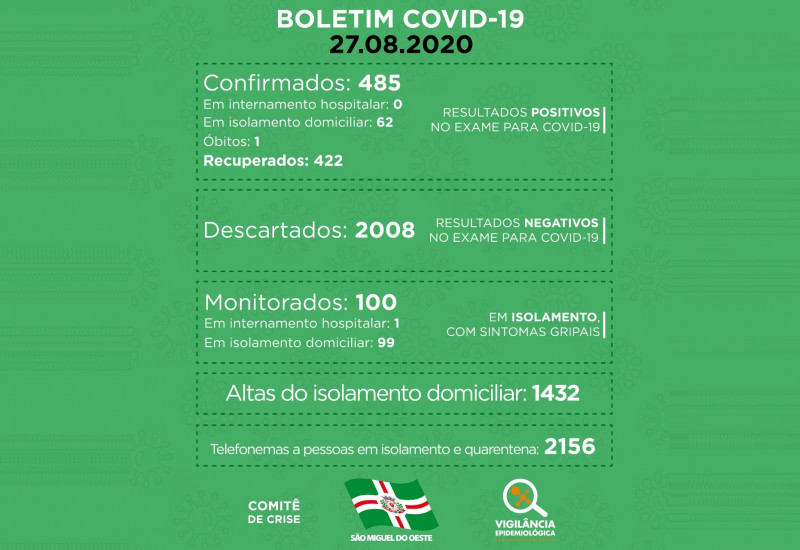 Nenhum novo caso de covid-19 foi registrado nesta quinta-feira (27), em São Miguel do Oeste. A informação foi divulgada pelo Comitê de Crise do município.