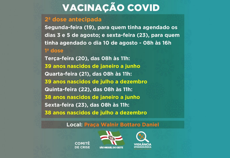 Na quinta (22), receberão a primeira dose da vacina, das 08h às 11h, as pessoas com 38 anos de idade nascidas entre os meses de janeiro e junho e, na sexta (23), neste mesmo horário, as pessoas com 38 anos nascidas entre julho e dezembro.