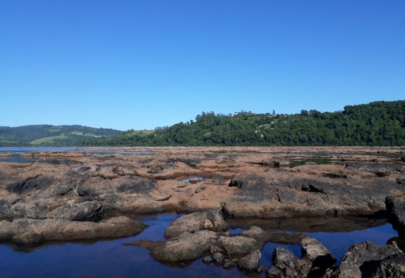 vistas no Rio Uruguai, com redução drástica no nível da água. Registros