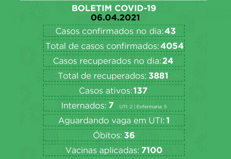 No total, 4054 pessoas foram confirmadas com a doença no município, das quais 3881 já se recuperaram e 137 estão com o vírus ativo.