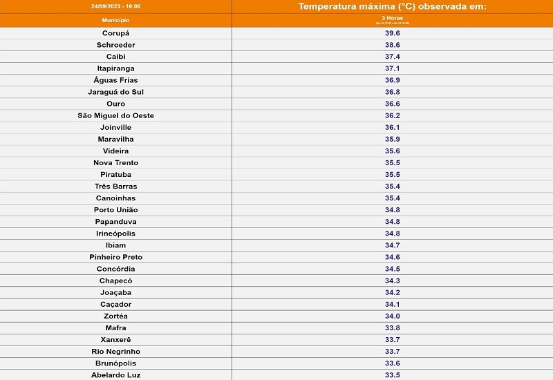 39,6ºC em Corupá, município do Norte catarinense, segundo tabela com as maiores