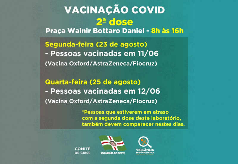 Na segunda-feira (23), receberão a segunda dose da vacina Oxford/AstraZeneca/Fiocruz, as pessoas que receberam a primeira dose no dia 11 de junho, e tiveram antecipada a aplicação da dose complementar, inicialmente marcada para o dia 1º de setembro.