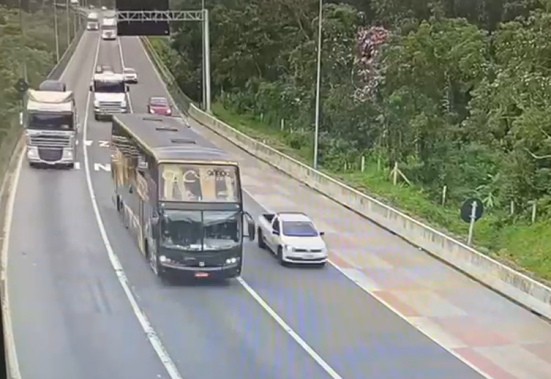 As imagens mostram o ônibus descendo a Serra em alta velocidade, antes de colidir com uma mureta no km 668 da rodovia.