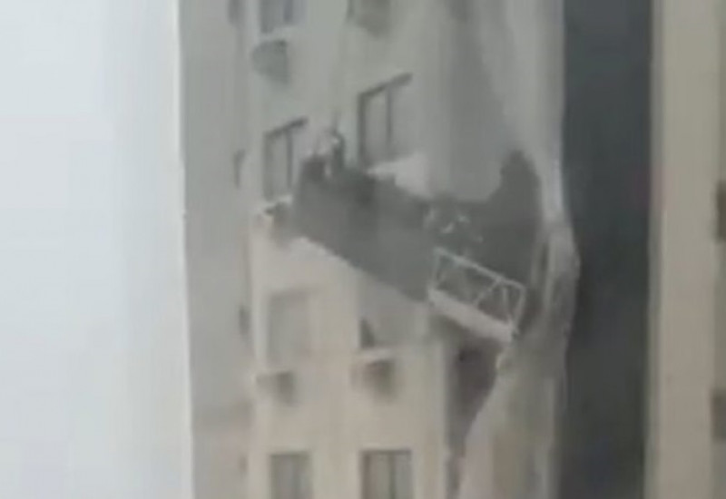 trabalhadores que ficaram presos em um andaime durante o vendaval ocasionado